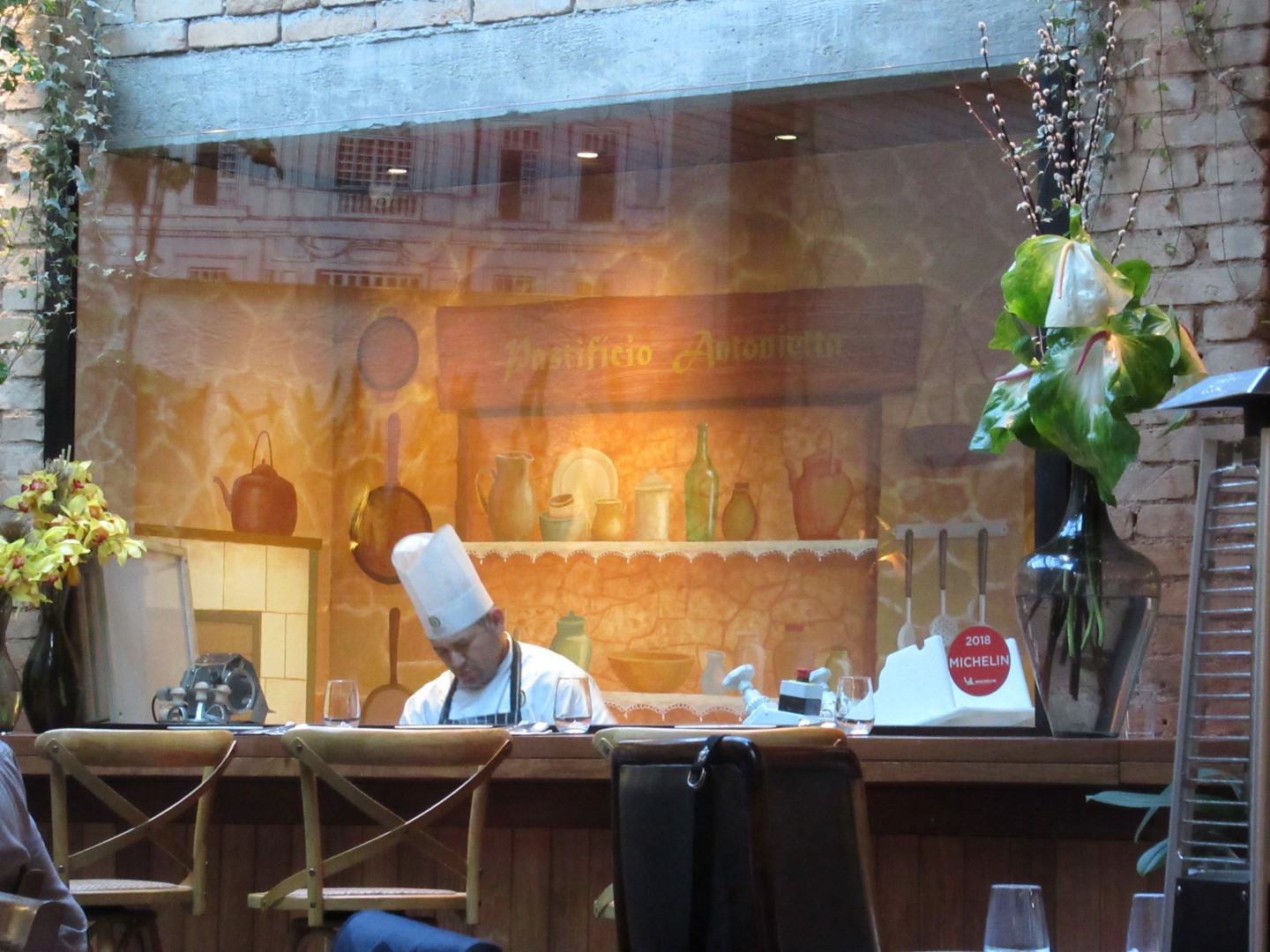 Este es un restaurante italiano hasta la médula. Empezando por Antonio el chef, que elabora la pasta a la vista de todos, con lo cual queda garantizada su frescura. Siguiendo por los ochenta vinos, todos italianos también, que probé y elegí uno por uno, a partir de la oferta de los siete importadores con que trabajamos. Así que aquí no tenemos ni Cabernet Sauvignon, ni Malbec, ni Tempranillo.