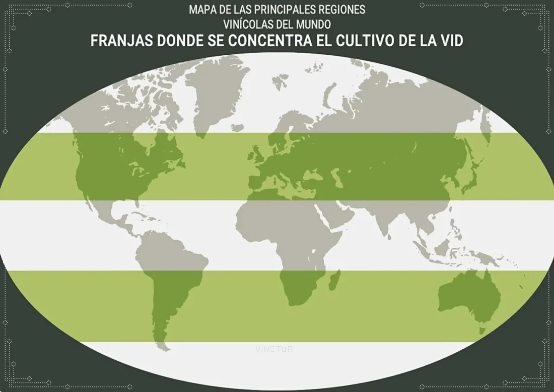 En todo curso inicial sobre vinos nos enseñan que la vid puede crecer principalmente en las zonas templadas de nuestro planeta, más precisamente entre los 30 y los 50 grados de latitud, en ambos hemisferios. En estas dos franjas están comprendidas las principales regiones vitivinícolas: el Viejo Mundo, y también Nuevo Mundo integrado entre otros por: California, Mendoza, Stellenbosch en Sudáfrica, el valle de Barossa en Australia y las dos principales islas de Nueva Zelanda. Por su parte, nuestro país se encuentra en su totalidad dentro de esta zona de privilegio