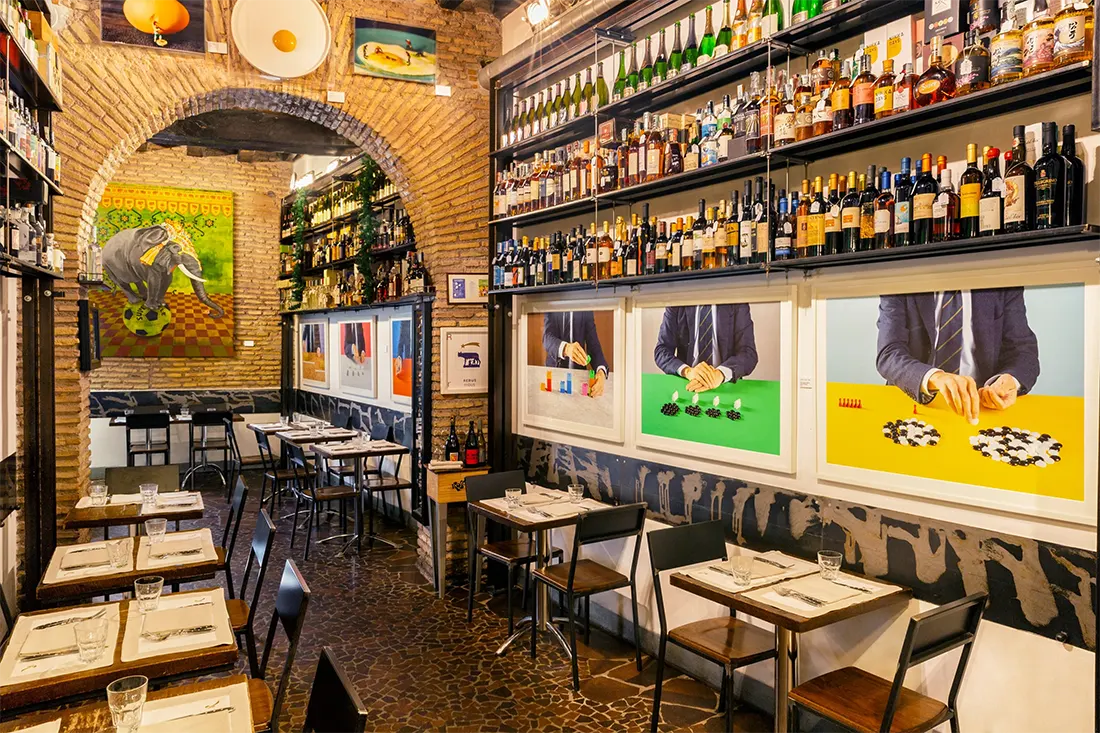 El ambiente es vibrante y bullicioso y las mesas están rodeadas de estanterías repletas de botellas de vino – se habla de unas 2.800 – y mostradores con más de 150 tipos de carnes curadas y 350 variedades de quesos. En resumen, es un «templo» para los amantes de la comida y los mejores vinos.