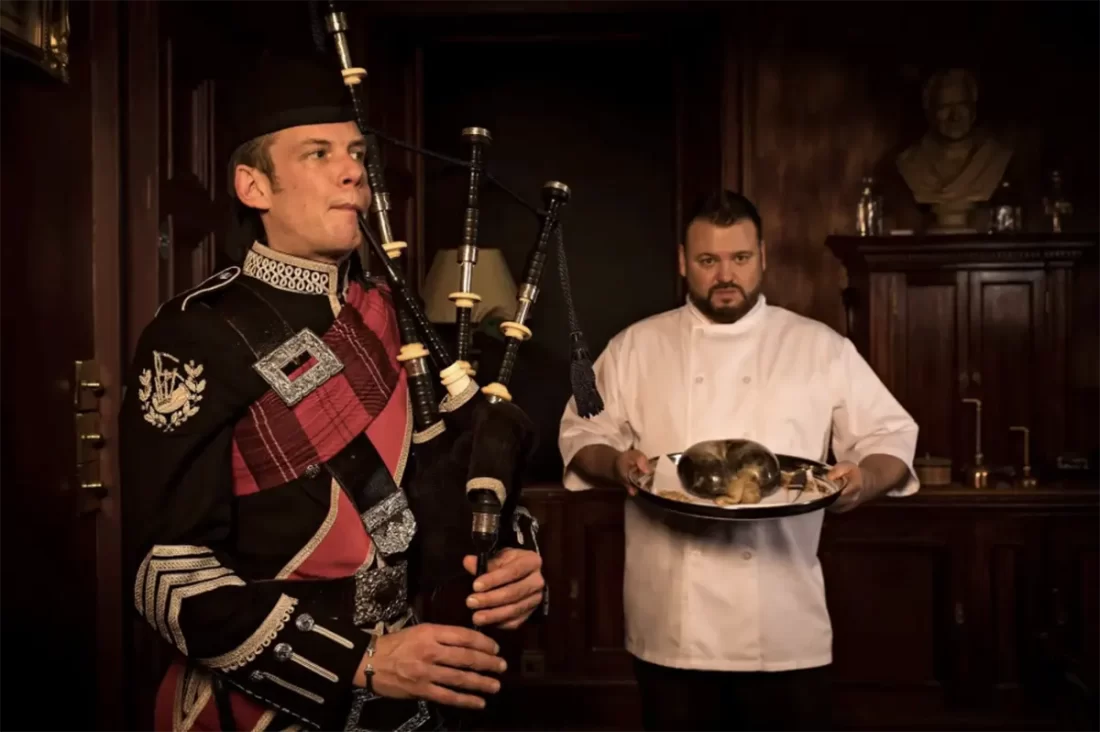De pie, los invitados reciben el haggis, escoltado por un gaitero. El anfitrión recita el poema Address to a Haggis, uno de los textos más célebres de Burns. No es solo un plato: es identidad, ironía y orgullo escocés.