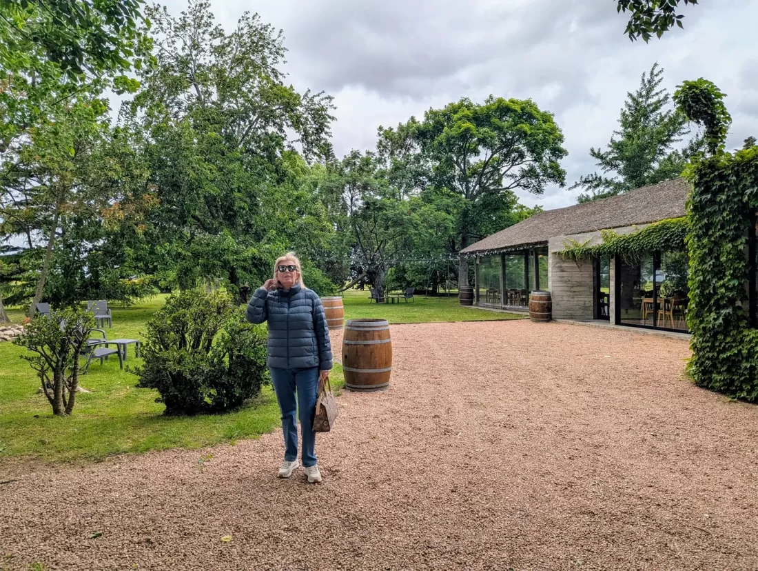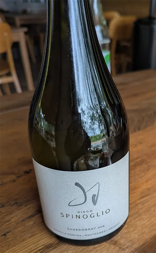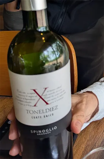 La degustación fue una sucesión de descubrimientos y sorpresas: comenzamos con un Chardonnay, muy bien logrado realmente, con tipicidad varietal y su aroma inconfundible. Seguimos con un Cabernet Franc 2023. Nos aclaran que no usaron viñas locales sino uvas del viñedo situado en Cerro del Toro, en Piriápolis. Bien logrado, agradable en boca y con 13, 3º de alcohol. Lo que siguió fueron palabras mayores: Tonel Diez, Corte único. Blend de cosechas del 2009 al 2023 seleccionando lo mejor de cada añada: 40% Cabernet Franc, 40% Tannat y 20% Merlot. Aplausos en la barra…, excelente…, nos encantó. Un vino de guarda y para esperarlo unos años.